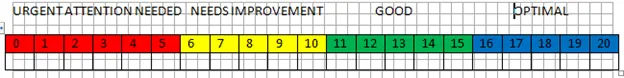 The score of 13.5 is then located on the grid below, falling on the dividing line between 13 and 14. This means that for the past week Breath Awareness and Retraining performance was in the “good” category. Overall, this means that the person taking this pretest was doing well with being conscious and intentional in his or her Breath Awareness and Retraiining. However, there is still substantial room for improvement. In fact, even with a perfect score there is no limit to how masterful with can become in this Mindful Choice. No set of skills is more important.