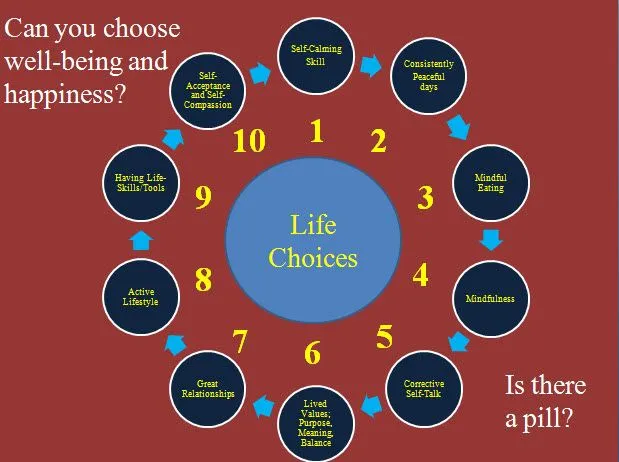 Now suppose on the other hand that instead of giving you a lengthy list we gave you an assessment covering 10 choices, actually 10 choice areas , each carefully selected based upon 40 years of helping people overcome stress, anxiety and depression, and journey toward a life of balance and well-being. Suppose the assessment showed you clearly where you were on a path to well-being, and clearly identified your good choices, bad choices, and opportunities for enriching your life.